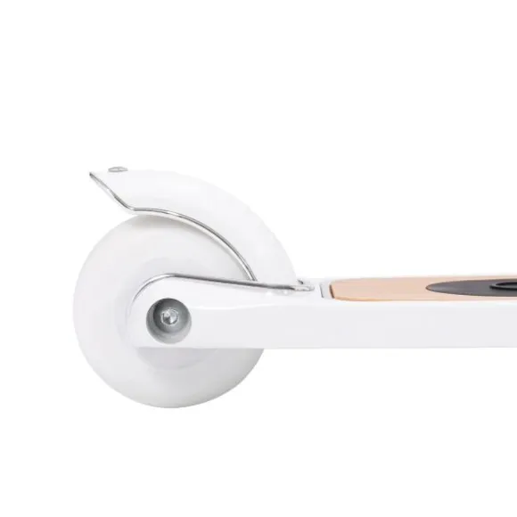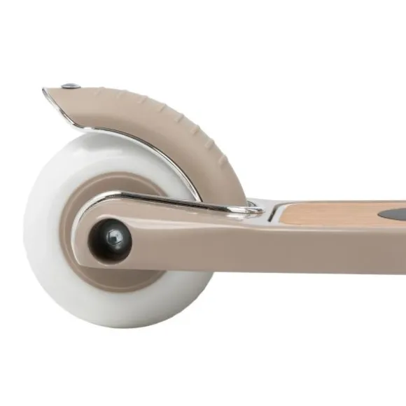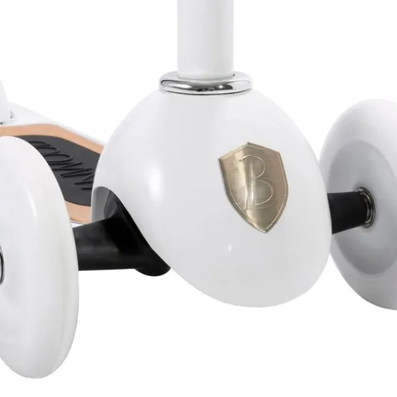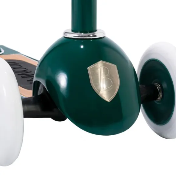 De step heeft een lichtgewicht constructie met een stevige aluminium onderzijde en een breed eikenhouten dek met antisliptape voor extra grip. Het stuur is in drie hoogtes verstelbaar (70, 75 en 80 cm) en groeit mee met je kind. De rubberen handgrepen zorgen voor een comfortabele en stevige grip, terwijl de achterrem extra veiligheid biedt tijdens het rijden.