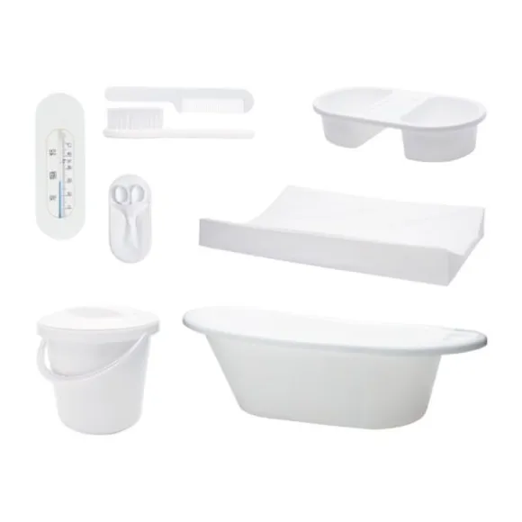Met deze handige Bébé-Basics Badset 8-delig Wit heb je alles bij de hand om je kindje te wassen en te verschonen. Het waskussen is zacht en comfortabel voor je kindje. De set wordt geleverd inclusief handige verzorgingsproducten zoals een schaartje en een borstel en kam.