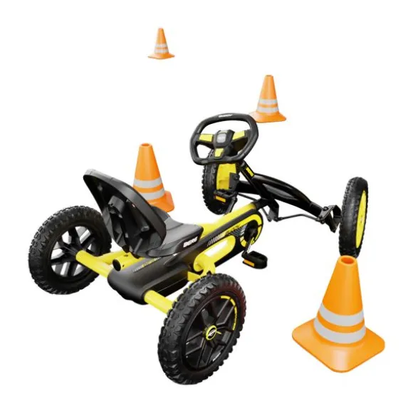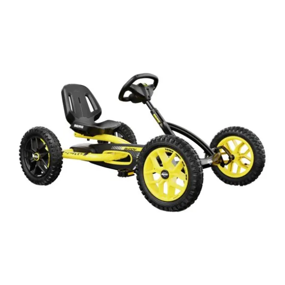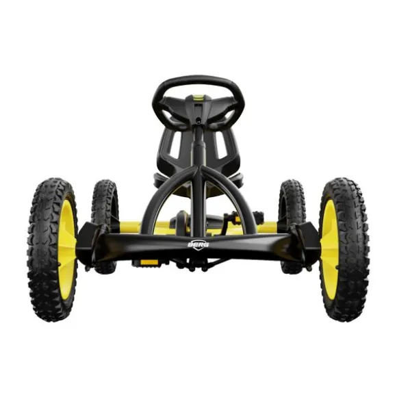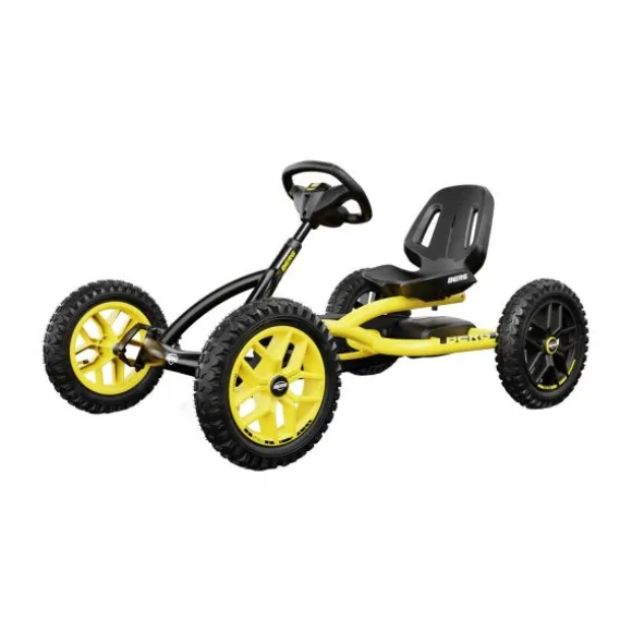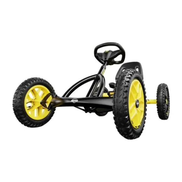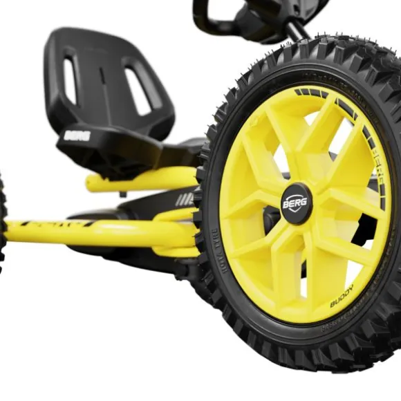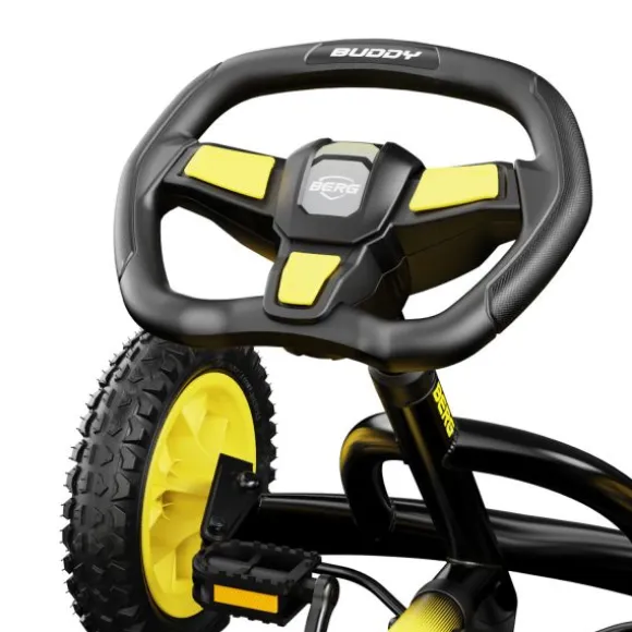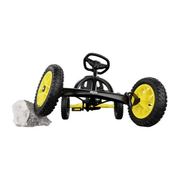 Dankzij de vier wielen heeft de BERG Buddy Cross een uitstekende stabiliteit, waardoor kantelen in scherpe bochten wordt voorkomen. De schommelas helpt bij het opvangen van schokken op oneffen ondergronden, zodat de skelter stevig op de grond blijft. De luchtbanden bieden extra grip en rijcomfort, waardoor je soepel en snel vooruitkomt.