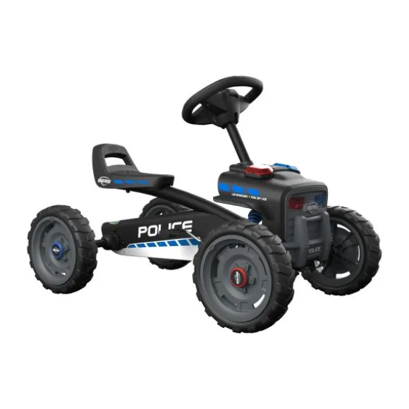Bij de BERG Buzzy Police zijn het stuur en de trappers onafhankelijk van elkaar. Dit betekent dat de trappers niet meebewegen tijdens het sturen, waardoor de voeten stevig op hun plek blijven. De skelter kan zowel voor- als achteruit rijden, en het stoeltje is verstelbaar in drie standen.