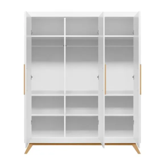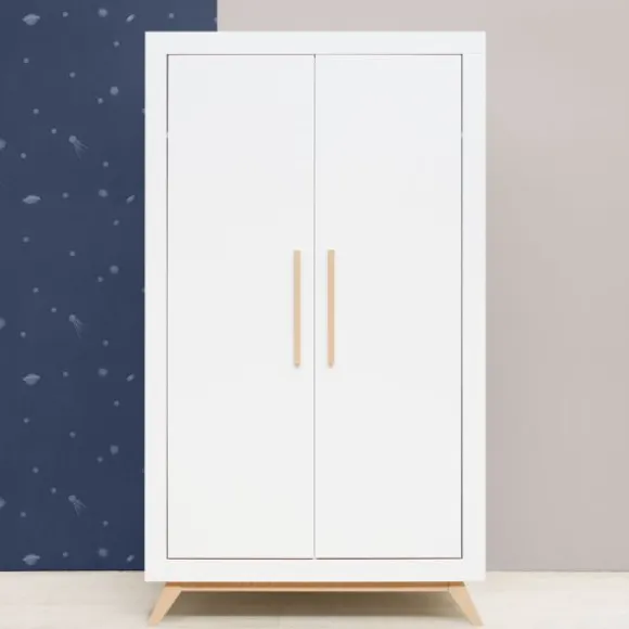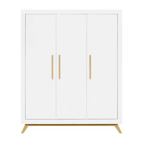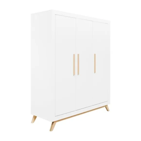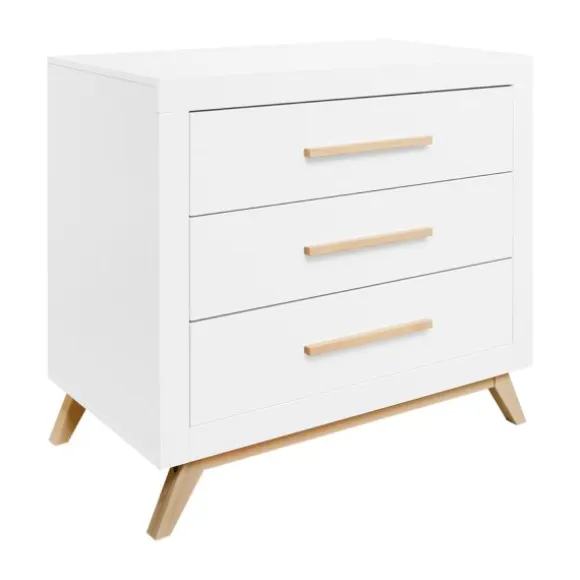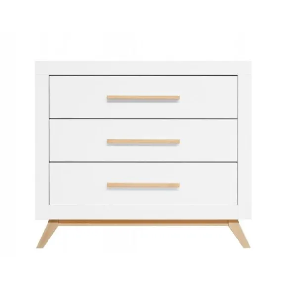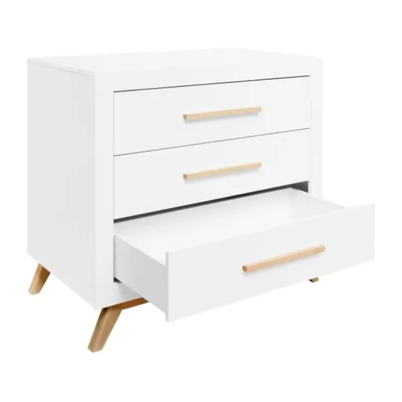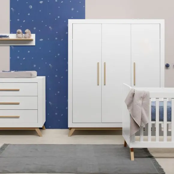 De Fenna babykamer kenmerkt zich aan de beukenhouten onderstel met schuine poten en de strakke handgrepen in deze kleur. De beukenhouten kleur is verder gecombineerd met wit. De laden van de commode beschikken over een soft-close systeem zodat het meubel niet gauw beschadigd. Het is een babykamer in een Scandinavische look!