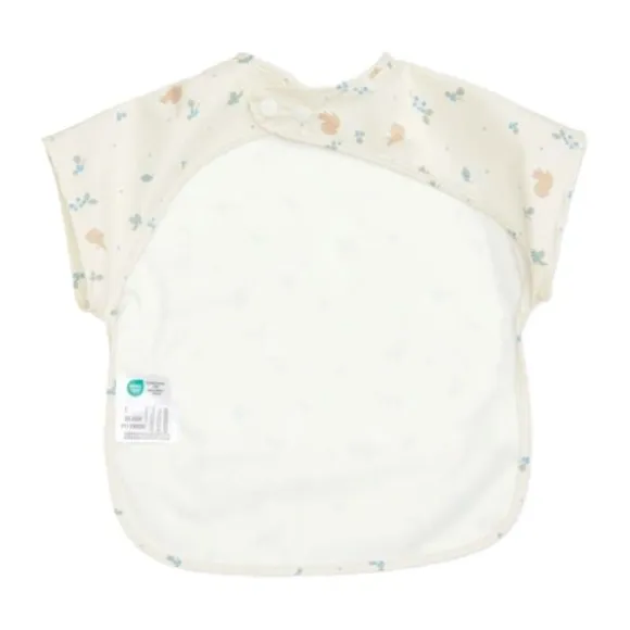 De slab is gemaakt van duurzaam, waterafstotend en Oeko-Tex gecertificeerd materiaal dat gemakkelijk schoon te maken is met een doekje of in de wasmachine. Dankzij de drukknoopsluiting aan de achterkant is de slab snel aan en uit te trekken, zelfs bij beweeglijke kleintjes. De geïntegreerde opvangrand aan de onderzijde vangt kruimels en restjes efficiënt op.