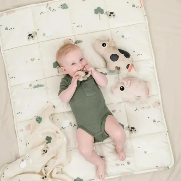 De Done By Deer Speelmat – Tiny Farm – Sand biedt een zachte en comfortabele plek waar je kindje veilig kan spelen. Deze dik gewatteerde speelmat is geschikt vanaf de geboorte en vormt een ideale ondergrond voor buiklig, kruipen of eerste speelmomentjes. Met schattige boerderijdieren zoals Dotti, Pigee en Sheepy op de ene zijde en een effen zandkleurige achterkant, is de mat ook nog eens stijlvol én omkeerbaar. Dankzij twee elastische lusjes kun je eenvoudig favoriete speeltjes van je kindje bevestigen, voor extra speelplezier. De mat is gemakkelijk op te vouwen en mee te nemen naar opa en oma, een dagje uit of een weekendje weg. Zo heb je altijd een vertrouwde speelplek bij de hand.
