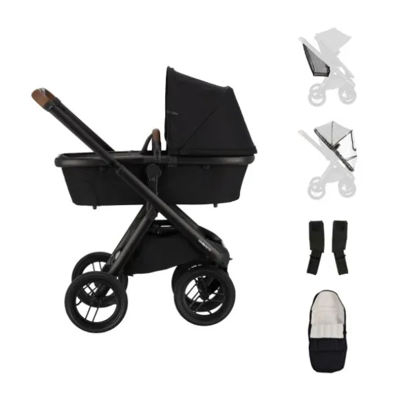 Deze complete 4-in-1 kinderwagenbundel bestaat uit: het Dubatti One E6 frame met een donkerbruin leren handvat, reiswieg, zitting, zonnekap, veiligheidsbeugel, voetenzak, regenhoes, autostoeladapters, boodschappennet, het Dubatti by Römer Autostoeltje Babysafe Pro – Pitch Black én de bijbehorende Vario Base 5Z. Alles wat je nodig hebt, stijlvol in één set.