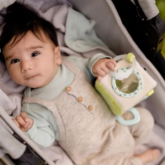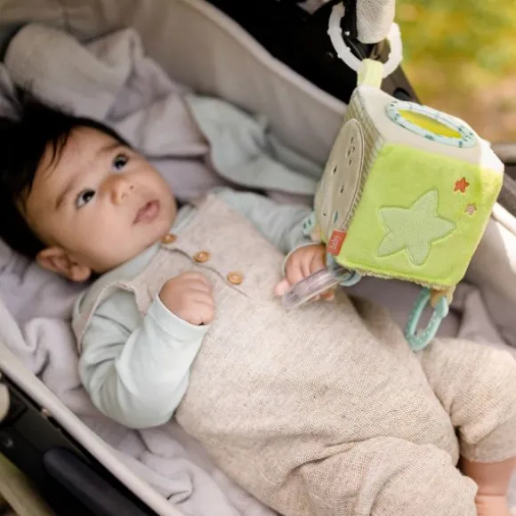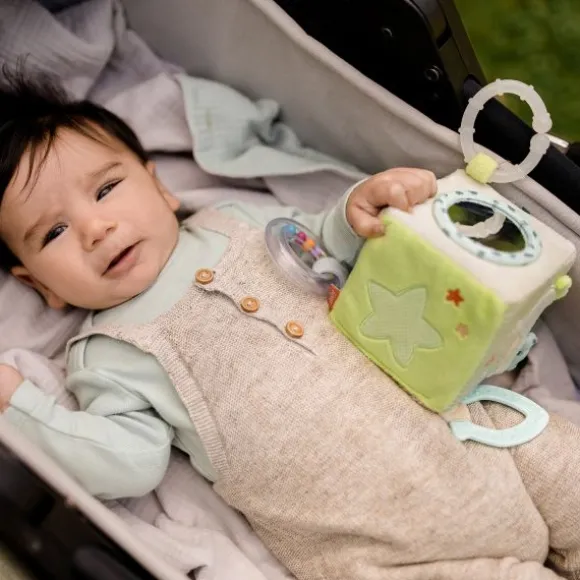 De Fehn Activity Kubus – Sea Children – Multikleur zit boordevol ontdekkingen voor nieuwsgierige babyhandjes. Elke zijde van deze zachte kubus biedt iets nieuws: een rammelaar, spiegeltje, knisperstof of bijtring. Perfect om spelenderwijs de zintuigen, fijne motoriek en grijpreflex te stimuleren vanaf de geboorte. De zachte kleuren, verschillende structuren en schattige zeediertjes maken deze kubus onweerstaanbaar. De bijtring helpt bovendien bij doorkomende tandjes, terwijl het spiegeltje je kindje kennis laat maken met zijn of haar eigen reflectie. Dankzij de praktische C-ring bevestig je de kubus eenvoudig aan de kinderwagen, autostoel of box – ideaal voor thuis én onderweg.