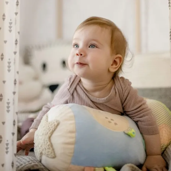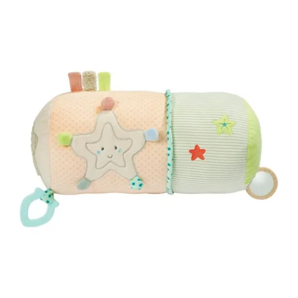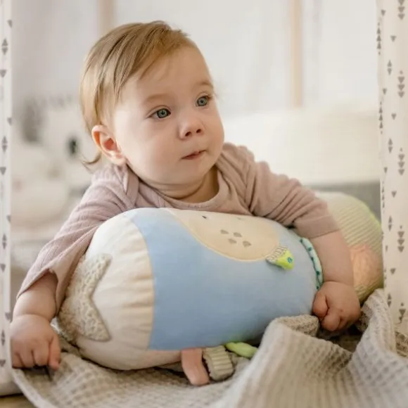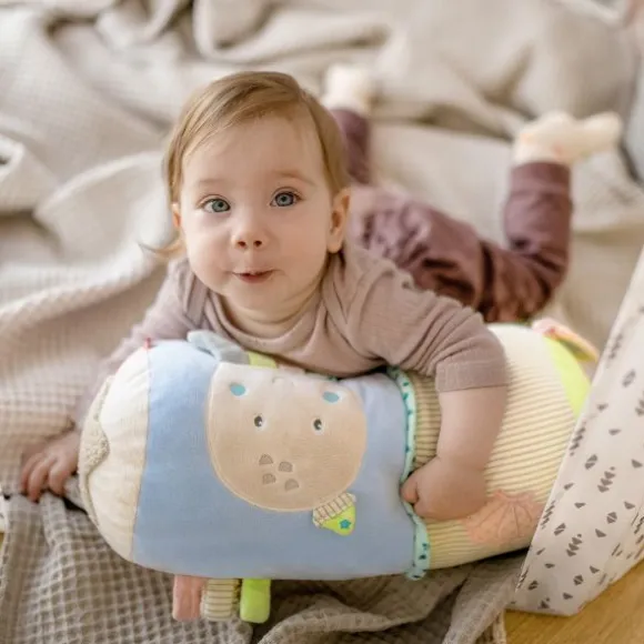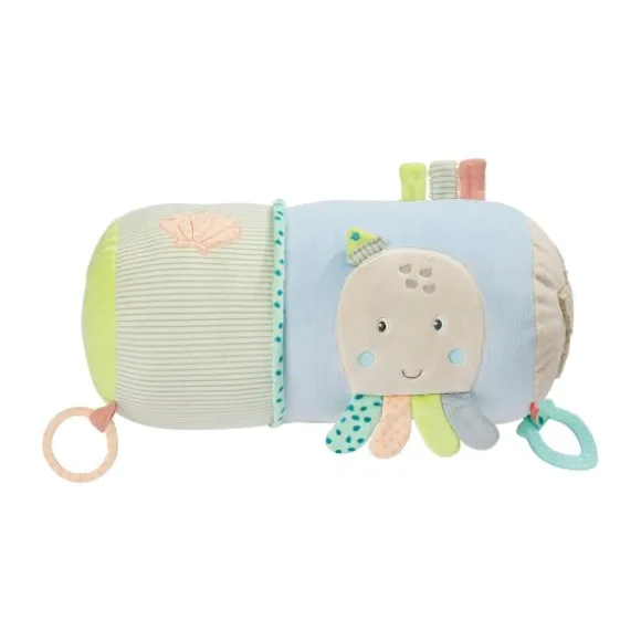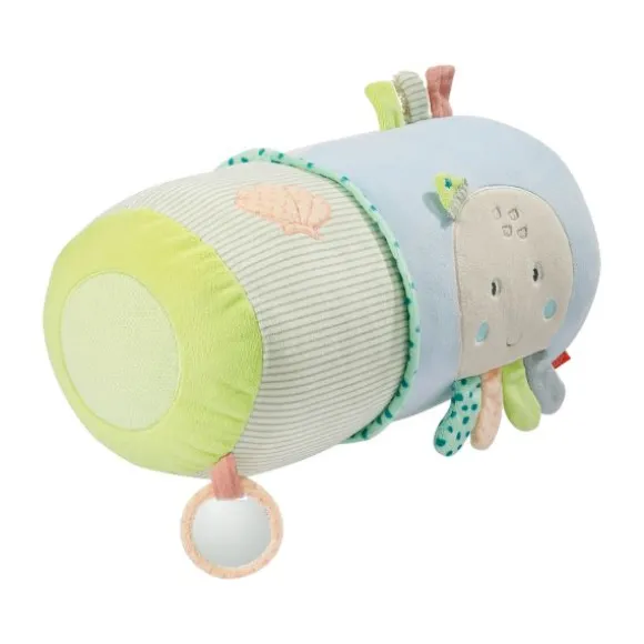 De Fehn Kruiprol – Children Of Sea helpt je kindje spelenderwijs bij de eerste kruipmomenten. Dankzij de zachte vulling biedt de rol comfortabele ondersteuning terwijl je kleintje leert balanceren en bewegen. De vrolijke zeedieren, kleurrijke labels en verschillende texturen stimuleren de zintuigen én motoriek op een speelse manier. De rol bevat allerlei verrassende elementen: een spiegeltje voor zelfontdekking, een bijtring, rammelaar, knisperpapier en kleine belletjes die het gehoor prikkelen. Ideaal om thuis mee te spelen, maar ook handig mee te nemen op bezoek of vakantie.