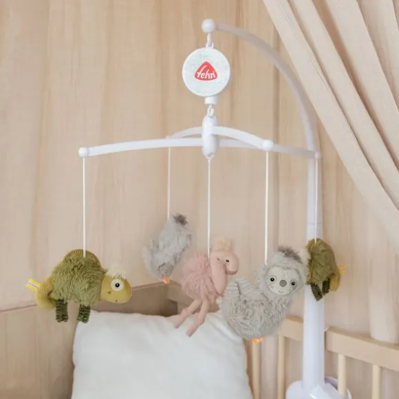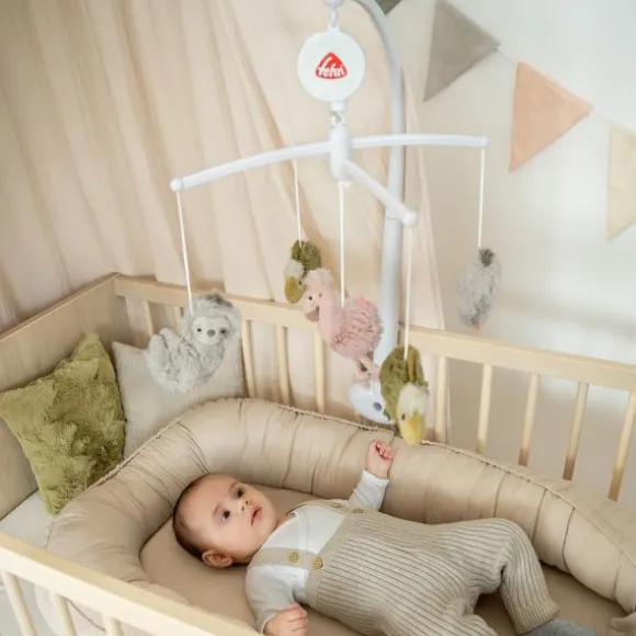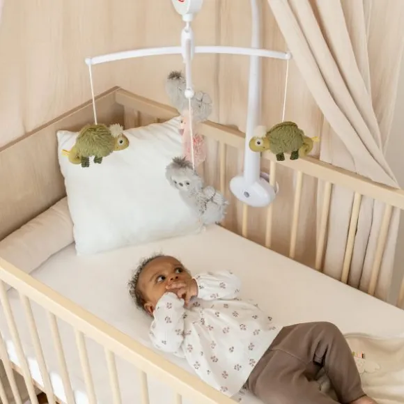 Deze lieve muziekmobiel van Fehn zorgt voor rust én vermaak in het babybedje. De ronddansende luiaards, flamingo’s en kameleons trekken de aandacht en stimuleren de zintuigen van je baby – perfect voor een kalmerend slaapritueel. De zachte kleuren en materialen zorgen voor een warme sfeer in de babykamer. De bekende melodie “Guten Abend, gut’ Nacht” (Brahms) laat de figuurtjes zachtjes draaien en nodigt uit tot luisteren en dromen. De mobiel is eenvoudig te bevestigen aan het ledikant en heeft een aan/uit-schakelaar.