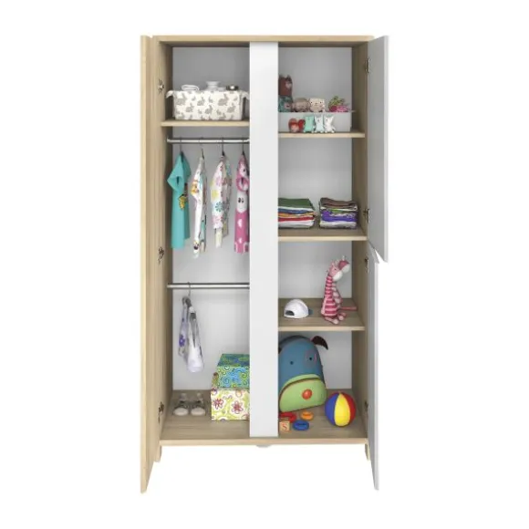 Achter de drie deuren vind je een praktische indeling die volop ruimte biedt voor het opbergen van kleding, speelgoed en verzorgingsbenodigdheden. Links zijn twee kledingroedes en een ruime plank aangebracht – ideaal voor jasjes, jurkjes en shirts. Aan de rechterzijde bevinden zich vier legplanken, die zich perfect lenen voor gevouwen kleding, mandjes of speelgoed. Dankzij het soft-close systeem sluiten de deuren geruisloos en veilig.