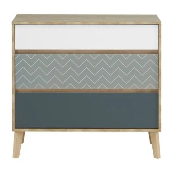 De commode is vervaardigd uit duurzame spaanplaat met een melamine afwerking en voorzien van subtiele witte en blauwe accenten voor een speelse twist. De stevige constructie en functionele vormgeving maken deze commode tot een onmisbaar meubelstuk dat perfect te combineren is met de andere items uit de Gami Larvik collectie.