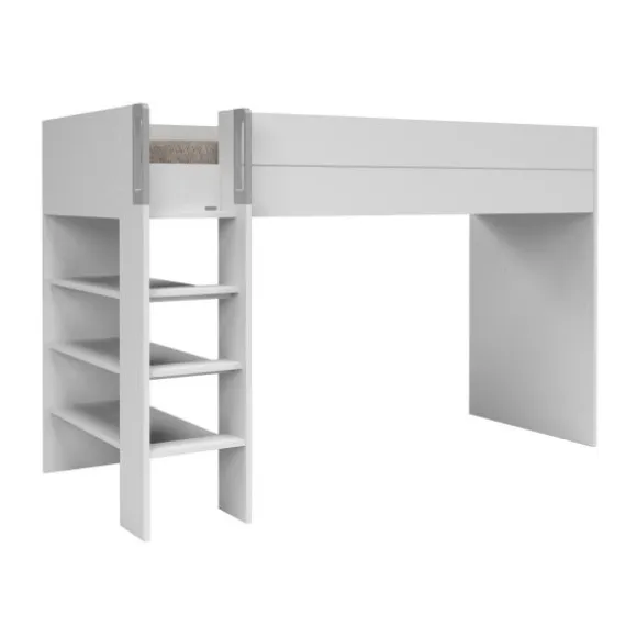 De Gautier Dimix Trio Hoogslaper in het wit is een slimme en complete oplossing voor compacte slaapkamers. Deze multifunctionele hoogslaper combineert een slaapplaats, bureau en opbergruimte in één stijlvol ontwerp. De veilige trap met brede treden en ingebouwde planken biedt niet alleen gemakkelijke toegang tot het bed, maar ook handige extra opbergruimte. Dankzij de omkeerbare opbouw (links of rechts te monteren) past deze hoogslaper perfect in elke kamerindeling. De hoogslaper is geschikt voor een 90×200 cm matras (max. 20 cm dikte) en beschikt over een stevig geperforeerd paneel als bedbodem. Aan het hoofdeinde is een extra opbergvak voorzien, ideaal voor boeken of een leeslampje. Het ingebouwde werkblad onder het bed is perfect voor huiswerk of creatief werk, en kan worden opengeklapt tot een diepte van 140 cm. Optioneel is er ruimte voor een leeslampje met USB-poort.