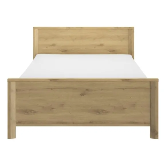 Dankzij het formaat van 120×200 cm biedt het bed extra ruimte voor comfort, terwijl het toch compact genoeg blijft voor kleinere kamers. De stevige constructie en duurzame materialen zorgen ervoor dat dit bed jarenlang meegaat. Het natuurlijke houtdecor geeft het bed een warme uitstraling en laat zich eenvoudig combineren met andere meubels in neutrale of natuurlijke tinten.