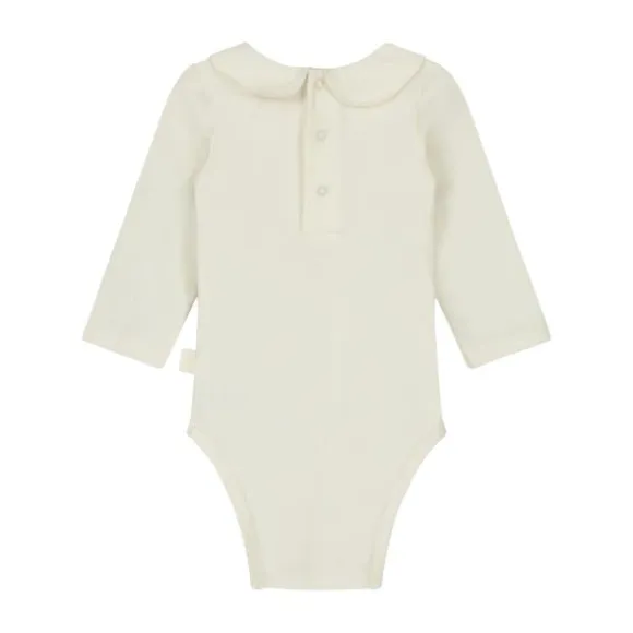 De romper heeft een elegant kraagje met overlock afwerking langs de randen, wat een verfijnde en tijdloze uitstraling geeft. Dankzij de praktische drukknoopsluiting tussen de beentjes en op de rug kun je je kindje eenvoudig aan- en uitkleden. Het subtiele Gray Label-logo is geborduurd op de achterzijde, net onder de nek, wat zorgt voor een herkenbaar en stijlvol detail.