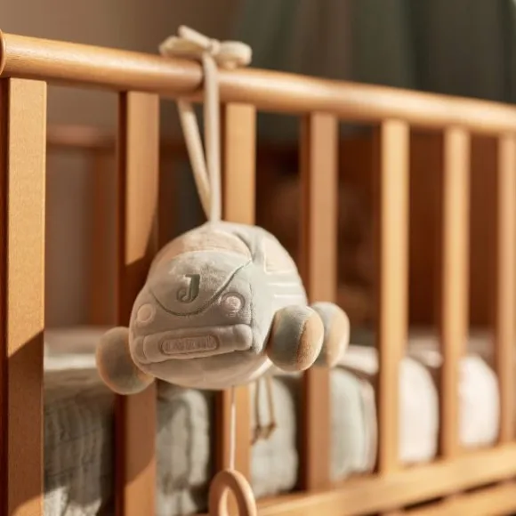 De muziekhanger is uitgevoerd in een mooie Sea Green kleur, met biscuitkleurige wielen en raampjes van zachte ribstof. Dankzij het knuffelbare ontwerp en de fijne structuren is dit muziekspeeltje niet alleen rustgevend, maar ook leuk om te ontdekken. Perfect om te bevestigen aan de box, het wiegje of de kinderwagen!