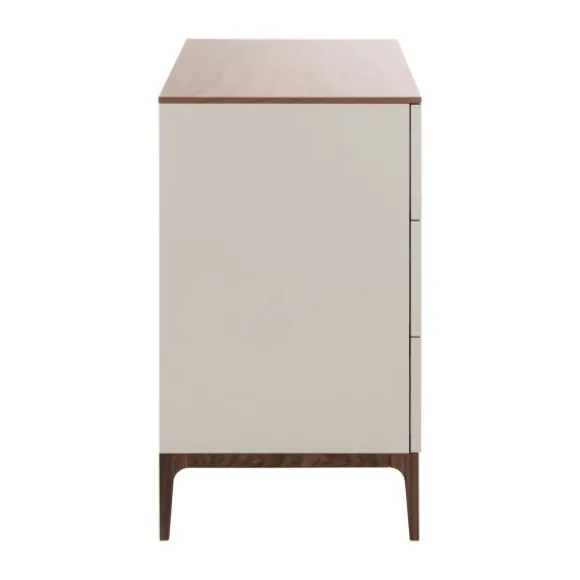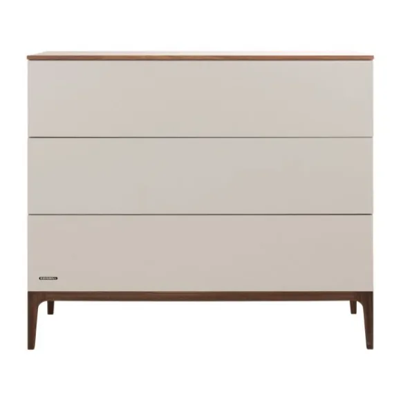 De Kidsmill Intense Commode – Oatmeal/Walnoot is de perfecte keuze als je op zoek bent naar een stijlvol vormgegeven commode, die rust en geborgenheid uitstraalt. De commode kenmerkt zich door de donkerbruine walnootgekleurde details, die de commode een chique en warme uitstraling geven. Daarbij is de commode voorzien van een strak en modern design in een neutrale oatmeal kleur. Hierdoor past de commode goed binnen verschillende babykamerinterieurs. Naast voldoende ruimte om je kindje te verschonen, beschikt de commode ook over drie ruime opberglades waarin je de spullen van je kindje gemakkelijk kunt opbergen. De lades zijn voorzien van een push-to-open en een soft-close systeem, hierdoor kunnen de lades geluidloos gesloten worden. Verder is de commode gemaakt van massief beukenhout met MDF en hoogwaardig plaatmateriaal. Dit hoogwaardige materiaal is bedoeld om lang mee te gaan.