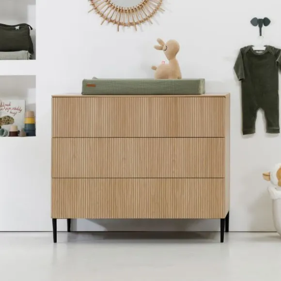 De Kidsmill Levi Babykamer Incl. Ronde Potenset Eiken | Ledikant 60 x 120 cm + Commode kenmerkt zich door de combinatie van een landelijke en tegelijkertijd ook strakke stijl. De meubels van de babykamer zijn gemaakt van hoogwaardig MDF en plaatmateriaal gecombineerd met een echte eiken fineerlaag. Daarnaast beschikt de Levi commode over voldoende opbergruimte, en is het ledikant verstelbaar in drie verschillende hoogtes. De verfijnde groeven in de fronten, samen met de metalen zwarte pootjes geven de meubels een frisse moderne look. Verder zijn de deuren en lades van de Levi babykamer voorzien van een push-to-open en een soft-close systeem