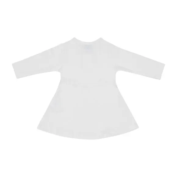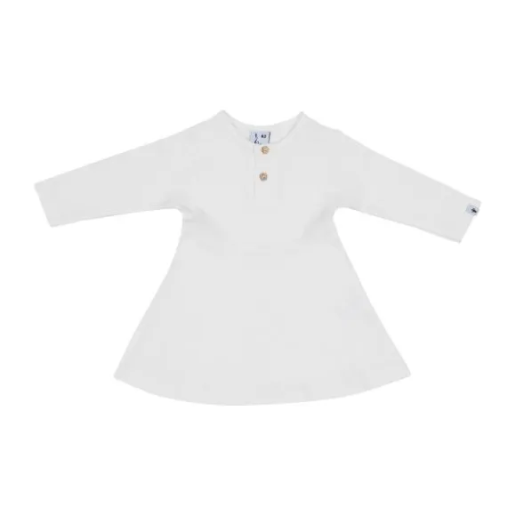 De jurk heeft een ronde hals, lange mouwen en een uitlopende rok, waardoor het een charmante en praktische pasvorm heeft. Aan de voorkant zijn twee houten knoopjes toegevoegd, wat het aan- en uittrekken extra makkelijk maakt. Dit duurzame kledingstuk is zacht voor de gevoelige huid en blijft mooi na veelvuldig wassen.