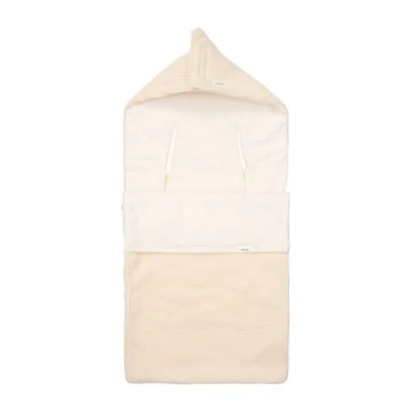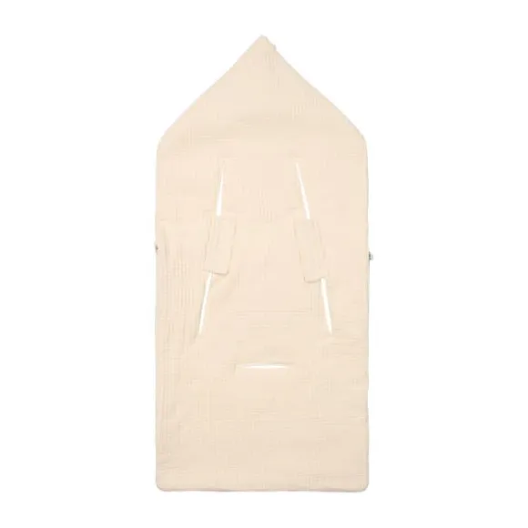 De voetenzak is voorzien van handige **gordelopeningen**, waardoor hij eenvoudig in een autostoeltje met een 3- of 5-puntsgordel past. De bovenkant kan worden omgevouwen tot een schattige capuchon, zodat het hoofdje van je baby lekker warm blijft. Dankzij de ritssluiting is de voetenzak gemakkelijk te openen en te sluiten.