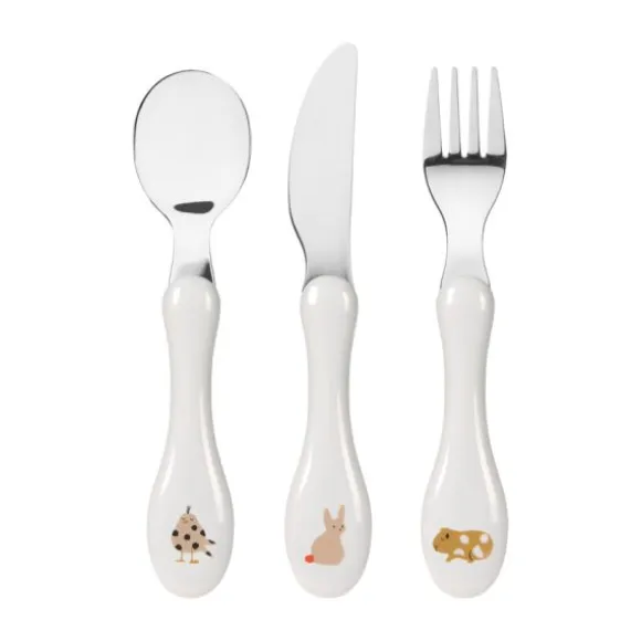 Het bestek is gemaakt van roestvrij staal met stevige kunststof handvatten, voorzien van speelse prints. Dankzij de afgeronde randen van het mes kunnen zelfs de kleinste fijnproevers veilig oefenen met zelfstandig eten. Geschikt voor kindjes vanaf 1 jaar.
