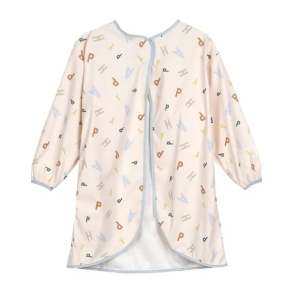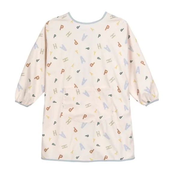 De slab sluit eenvoudig met klittenband op de rug en is geschikt voor kindjes van 6 tot 24 maanden. De elastiekjes bij de polsen zorgen voor een goede aansluiting, en de handige opvangzak aan de voorkant vangt etensresten en knutselmaterialen netjes op.