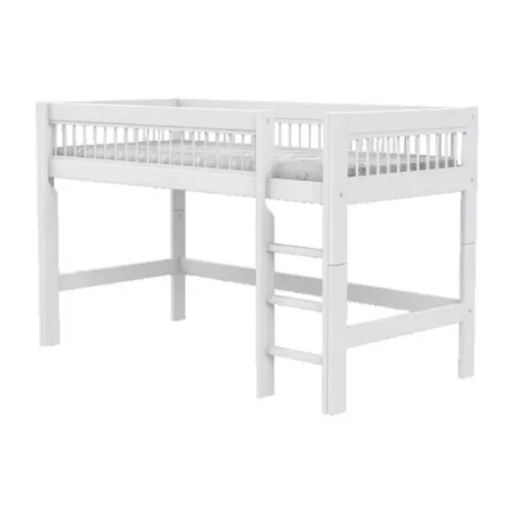 Het bed is gemaakt van massief grenenhout en afgewerkt in een frisse witte lak. De ladder kan flexibel links of rechts geplaatst worden, wat het bed geschikt maakt voor elke kamerindeling. De hoogte onder het bed bedraagt 89 cm, wat voldoende ruimte biedt voor speelgordijnen, opbergoplossingen of gewoon een gezellige speelhoek.