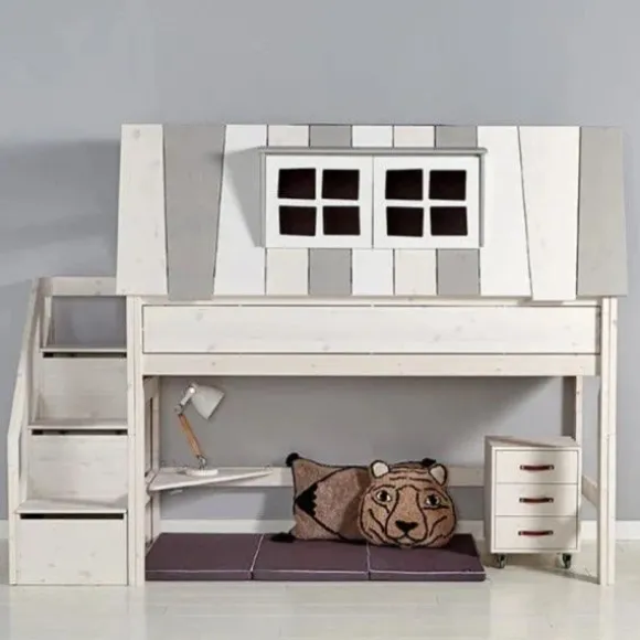 De LIFETIME Halfhoogslaper – My Hangout / Premium White Wash is een speels en stijlvol bed dat elk kinderhart sneller laat kloppen. Deze unieke bedopstelling is vormgegeven als een gezellig huisje met een speelse dakconstructie, vrolijke raampjes en een stoer trappensysteem met ingebouwde opberglades. Het ontwerp maakt van de slaapkamer een echte speelplek en biedt tegelijkertijd een comfortabele slaapplek op hoogte. Gemaakt van massief grenenhout met een white wash afwerking, straalt dit bed rust en kwaliteit uit. Dankzij de open ruimte onder het bed kunnen kinderen zich heerlijk terugtrekken in hun eigen hoekje om te lezen, spelen of dromen. De stijlvolle bekleding in rustige grijstinten zorgt ervoor dat het bed in elk interieur past, van klassiek tot modern. De trap is niet alleen veilig en kindvriendelijk, maar biedt ook extra opbergruimte in de vorm van handige lades in de treden. Het bed is voorzien van een stevige lattenbodem en kan later worden omgebouwd naar andere bedopstellingen uit de LIFETIME collectie. Zo groeit het mee met je kind en is het een duurzame investering voor jarenlang plezier. Het LIFETIME My Hangout bed is ideaal voor kinderen die houden van avontuur, fantasie en eigen ruimte. Combineer met bijpassende accessoires of meubels uit de LIFETIME serie voor een harmonieus geheel in de kinderkamer.