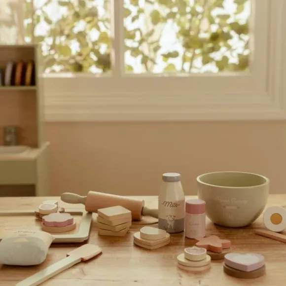 In de set vind je een houten mengkom met garde, deegroller, bakplaat met lekkernijen en allerlei ingrediënten zoals bloem, suiker, boter, melk en een ei. Ook zijn er koekjesvormen, een snufje zout en een receptenboekje inbegrepen, waarmee kinderen zelf ‘recepten’ kunnen volgen. Elk onderdeel is gedetailleerd vormgegeven en gemaakt van stevig materiaal, zodat het tegen een stootje kan.