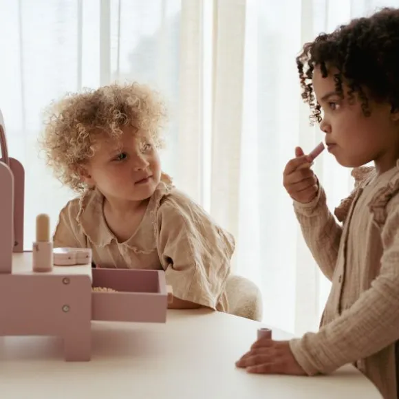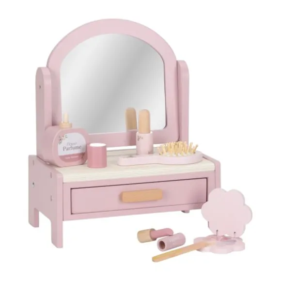 De set wordt geleverd met zes houten accessoires: een haarborstel, lippenstift, nagellak, parfumflesje, oogschaduw en een nagelvijl. De spiegel is kantelbaar, zodat je kindje zichzelf goed kan bekijken tijdens het opdoffen. In de lade onder de spiegel kunnen alle accessoires netjes worden opgeborgen, wat zorgt voor overzicht en gemak tijdens het spelen.
