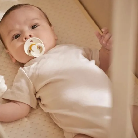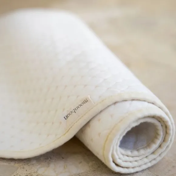 De Moonboon Waterdichte Matrasbeschermer – 32 x 90 cm – Nature is speciaal ontworpen voor gebruik in de Moonboon Babyhangmat. Deze matrasbeschermer combineert praktische bescherming met zachte materialen, zodat je baby comfortabel en droog blijft slapen – zelfs bij kleine ongelukjes. Het gewatteerde design in natuurlijke kleur past perfect bij elk interieur. De beschermer bestaat uit drie zorgvuldig gekozen lagen: een zachte bovenlaag van 100% biologisch katoen, een absorberende TPU-middenlaag en een badstof onderlaag van bamboe en polyester. Hierdoor is de matrasbeschermer ademend, huidvriendelijk én volledig waterdicht. Je legt hem eenvoudig op het matras en hij blijft goed op zijn plaats liggen. Of je nu thuis bent of onderweg, deze compacte matrasbeschermer is ideaal voor dagelijks gebruik. Hij is wasbaar op 60°C en blijft ook na herhaaldelijk wassen in topconditie. Zo zorg je elke dag opnieuw voor een frisse en veilige slaapomgeving voor je kleintje.