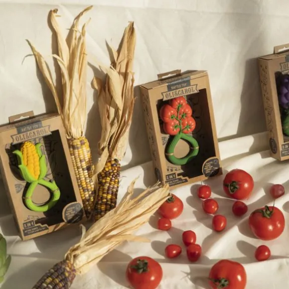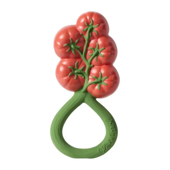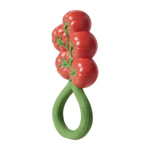 De Oli & Carol Rammelaar – Tomaat is een 2-in-1 bijtspeeltje en rammelaar, gemaakt van 100% natuurlijk rubber en gevuld met gerecyclede kersenpitten. Het zachte materiaal is veilig voor doorkomende tandjes en stimuleert de zintuigen van je kindje. Ontwikkeld met KNO-artsen voor een rustgevend geluid dat kalmeert zonder te overstimuleren. Dankzij het ronde ontwerp is de rammelaar gemakkelijk vast te houden en mee te nemen. Vrij van plastic, gaatjes en schadelijke stoffen: veilig en hygiënisch!