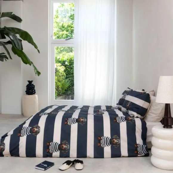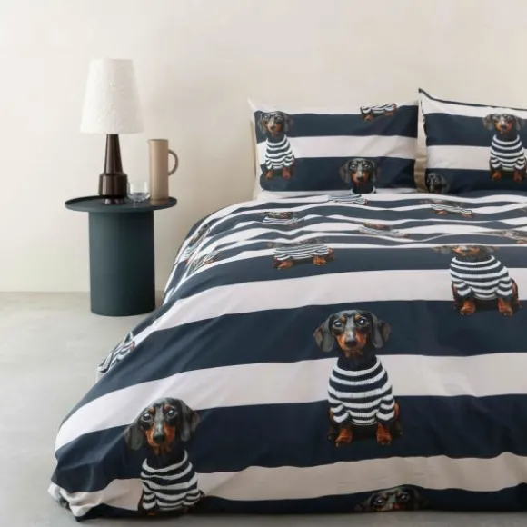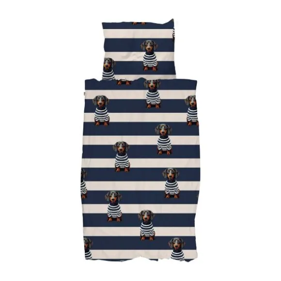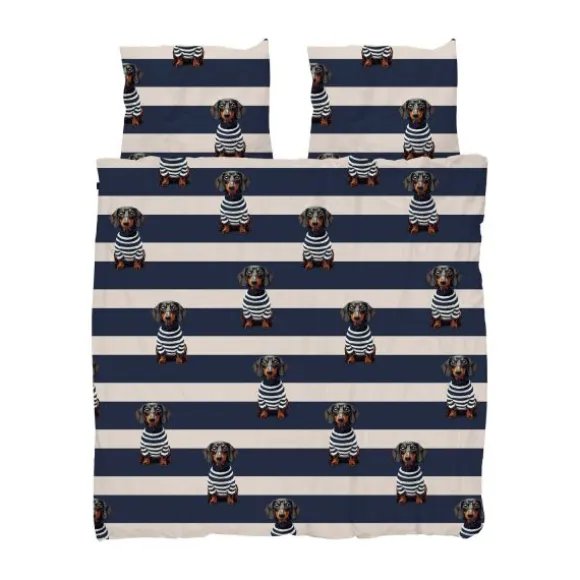 Het Snurk Dekbedovertrek – Pierre brengt stijl en gezelligheid in de slaapkamer. Op de Bretonse strepen ligt Pierre, de teckel, altijd klaar voor een knuffel of een dutje. Gemaakt van 100% biologisch katoen (160 TC), voelt het zacht en ademend aan en is het geschikt voor alle huidtypen. De set wordt geleverd met een kussensloop van 60×70 cm en heeft een extra lange dubbele instopstrook. Duurzaam geproduceerd in Portugal, met minder water en CO₂-uitstoot en onder eerlijke arbeidsomstandigheden. Comfortabel slapen met een goed gevoel!