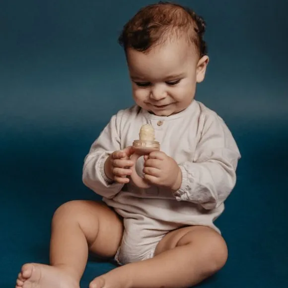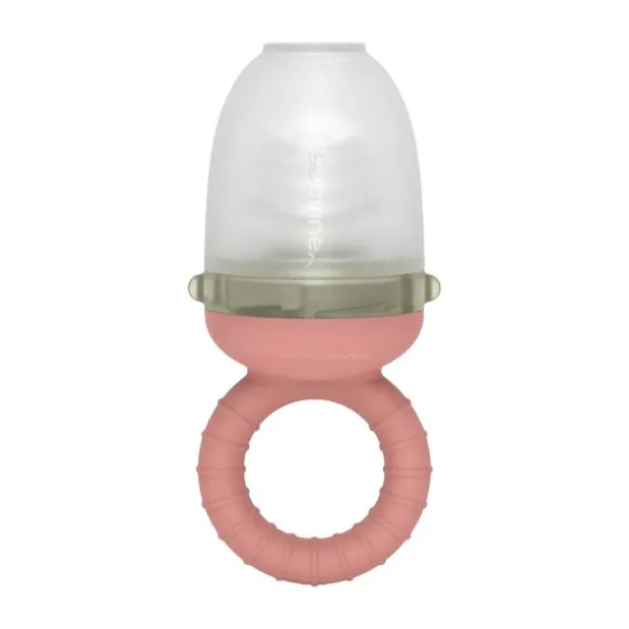 De zachte silicone speen is voorzien van fijne openingen waardoor alleen kleine stukjes voeding doorkomen. Zo wordt het risico op verslikken sterk verminderd. Het ringvormige handvat is makkelijk vast te houden door kleine babyhandjes en stimuleert de ontwikkeling van de fijne motoriek. Dankzij de meegeleverde beschermkap blijft de fopspeen hygiënisch tijdens het meenemen of bewaren.
