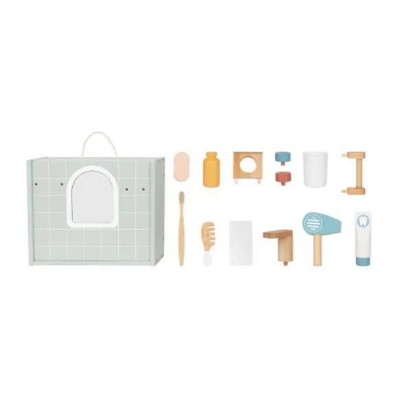 Maak van dagelijkse routines een feest met de Tooky Toy Badkamer Speelset Mini – Hout. Deze charmante houten badkamer speelset zit boordevol realistische details die kinderen helpen spelenderwijs vertrouwd te raken met persoonlijke verzorging. De set bevat onder andere een kapspiegel, een wasbak met draaiknoppen en kraan, en een complete collectie verzorgingsaccessoires. Je kindje kan zich uitleven met de houten föhn, tandenborstel met beker, tandpasta, zeep, lotion, kam en zelfs een handdoekje. Alles is ontworpen om echte badkamerartikelen na te bootsen en zo het belang van hygiëne spelenderwijs te stimuleren. Een leuke en leerzame manier om dagelijkse routines te oefenen!