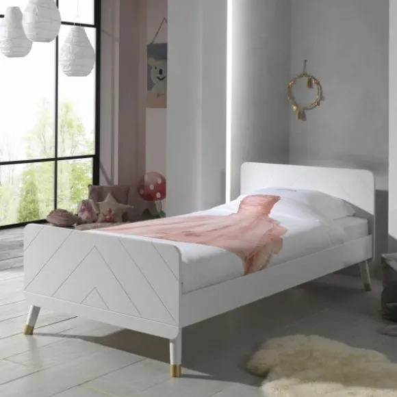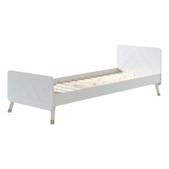 Met het Vipack Billy Bed Satin White 90 x 200 cm haal je een uniek meubel in huis. In het hoofd- en voeteind bevinden diagonale groeven en de zijkanten zijn afgerond waardoor er een retrolook ontstaat. Onder het bed zijn vier schuine poten gemonteerd in dezelfde kleur van het bed waarvan het onderste gedeelte bestaat uit een gouden kleur. Bij dit bed wordt een lattenbodem geleverd.
