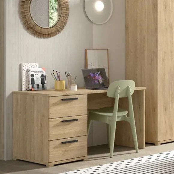 Gemaakt van sterk melamine is het bureau bestand tegen dagelijks gebruik en gaat het jarenlang mee. De drie ruime lades zorgen ervoor dat boeken, schriften en andere benodigdheden altijd netjes zijn opgeborgen en binnen handbereik blijven. Dankzij de praktische indeling en het tijdloze design vormt dit bureau niet alleen een functionele werkplek, maar ook een stijlvolle toevoeging aan het interieur van je kind.