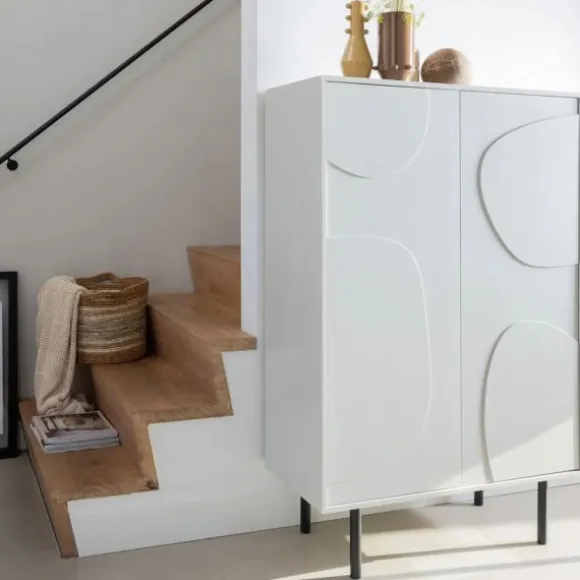 De Woood Opbergkast – Cadiz – Grenen Mist is een stijlvolle en moderne opberger met een subtiele speelse twist. Dankzij het strakke ontwerp, het organische houtpatroon op de deuren en de mistwitte kleur is deze kast een elegante toevoeging aan elk interieur. De zwarte metalen poten geven het geheel een stoere, eigentijdse uitstraling. Achter de twee deuren bevinden zich drie ruime opbergvakken waarin je moeiteloos speelgoed, kleding of woonaccessoires kwijt kunt. De verhoogde pootconstructie zorgt voor een luchtig effect in de kamer. Ideaal voor in de kinderkamer, hal of woonkamer. De kast is gemaakt van FSC-gecertificeerd grenenhout en voorzien van een duurzame laklaag, wat bijdraagt aan de lange levensduur.