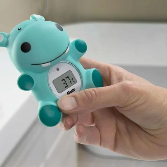 De Alecto BC-11 Badthermometer is uitgevoerd in een grappig nijlpaard design. Met deze badthermometer kun je op 1 graad nauwkeurig de temperatuur van het badwater of de kamer meten. Wanneer het water te warm is (>39°C) geeft de badthermometer een melding. De thermometer kan blijven drijven en is waterdicht. Er wordt een vervangbare batterij meegeleverd waarmee de badthermometer 365 uur gebruikt kan worden.