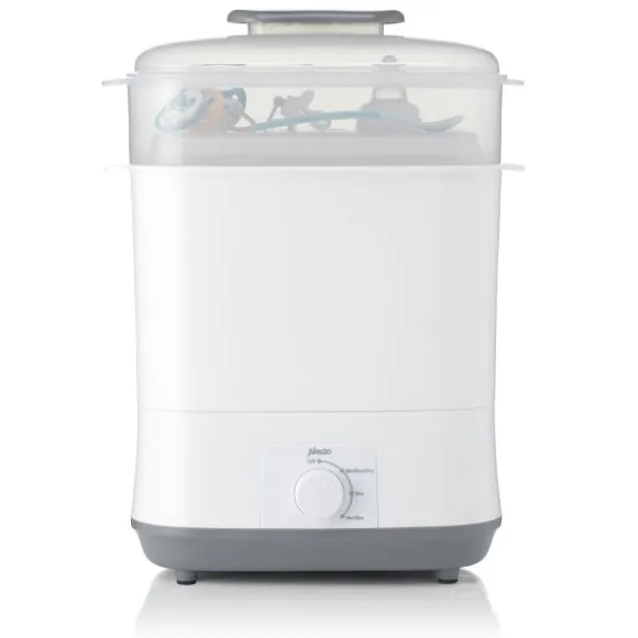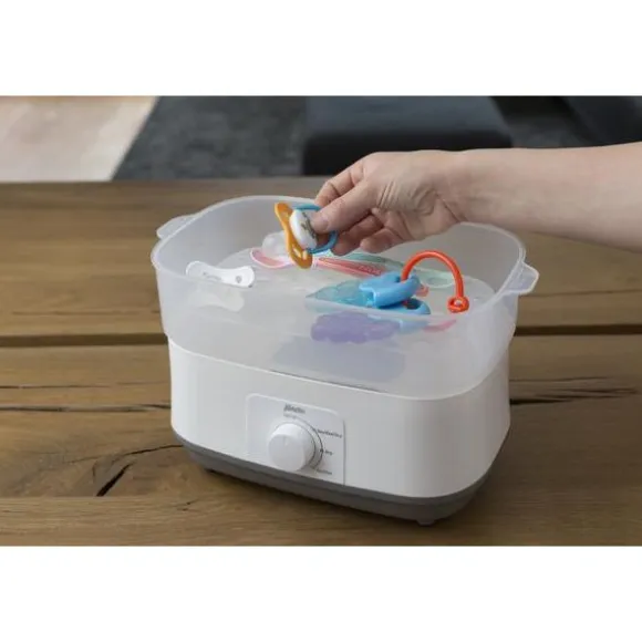 De Alecto Elektrische Stoomsterilisator met Droogfunctie is een praktische en hygiënische oplossing voor het snel en grondig reinigen van babyflessen en accessoires. Binnen slechts 12 minuten verwijdert de stoom 99,9% van alle bacteriën – ideaal voor drukke ouders die zeker willen zijn van een schone voeding voor hun kindje. De sterilisator biedt ruimte voor maar liefst 11 babyflesjes tegelijk, inclusief accessoires.