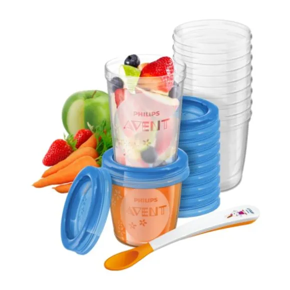 De Avent bewaarbekers zijn ideaal voor het bewaren van voeding, zowel thuis als onderweg. De set is gemaakt van BPA-vrij materiaal, en kan worden gebruikt in een flessenwarmer, magnetron, vaatwasser en sterilisator. Daarbij beschikken de bewaarbekers over een veilige afsluiting, zodat er niet met voeding gelekt kan worden. Op de bekers kun je de data en inhoud opschrijven, zo weet je precies wat er in elke beker zit. De bewaarbekers zijn stapelbaar, en geschikt voor de vriezer en koelkast.