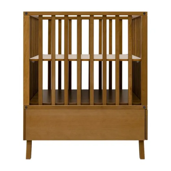 De bodem van de box is in hoogte verstelbaar: gebruik de hoge stand voor een pasgeboren baby en verlaag deze zodra je kindje zich begint op te trekken. De box is vervaardigd van hoogwaardig beukenhout en MDF, afgewerkt met een kindvriendelijke lak op waterbasis. De lade is voorzien van verticale groeven en leren lussen, wat zorgt voor een luxe afwerking.