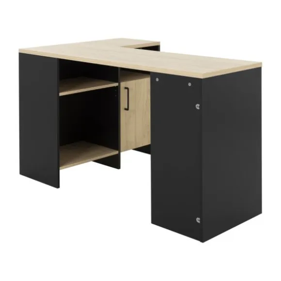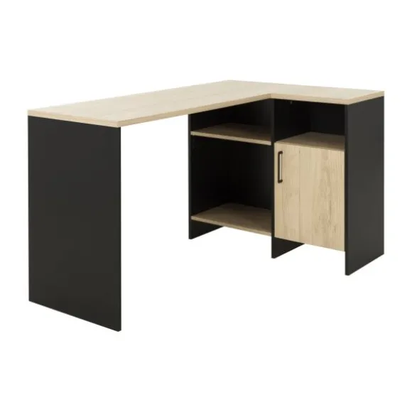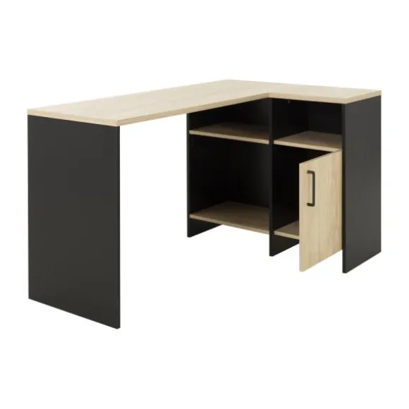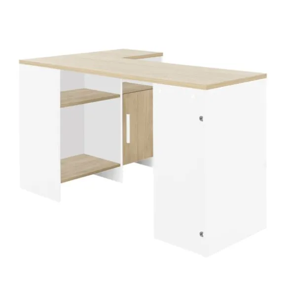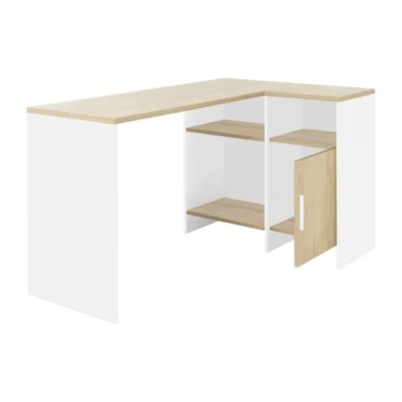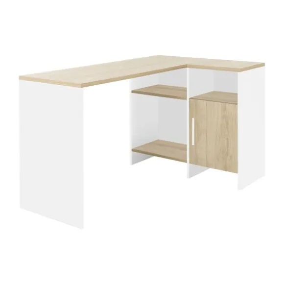 Het bureau is voorzien van drie open opbergvakken en een afsluitbaar compartiment met deur, ideaal voor het opbergen van kantoorbenodigdheden, boeken of persoonlijke items. De witte ABS-handgreep zorgt voor een strakke afwerking. Let op: dit bureau is niet omkeerbaar bij montage en is ontworpen met een vaste opstelling.