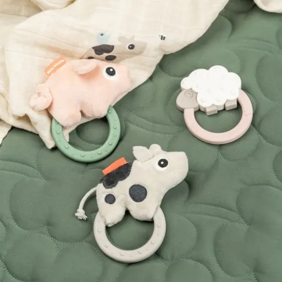 Bij beweging maakt de rammelaar een zacht rinkelend geluid, wat de nieuwsgierigheid van je baby prikkelt. De bijtring is gemaakt van **100% veilige, BPA-vrije siliconen**, waardoor je kindje er veilig op kan bijten. Bovendien heeft het speeltje verschillende texturen om te ontdekken en een handig lusje om het aan een speenkoord of kinderwagen te bevestigen.