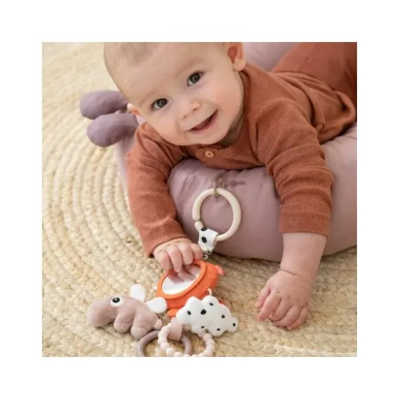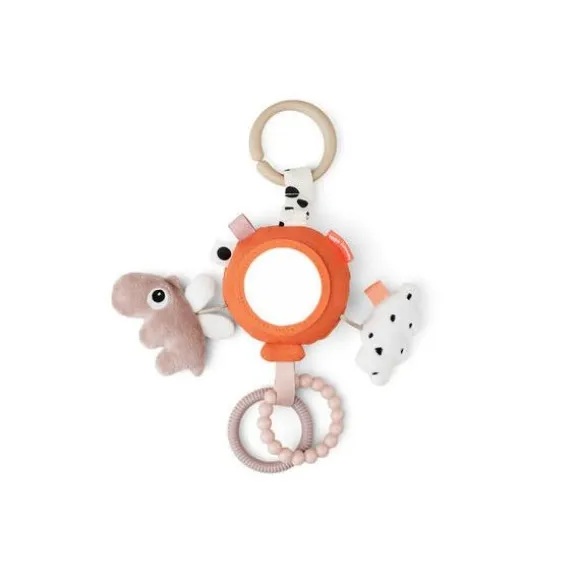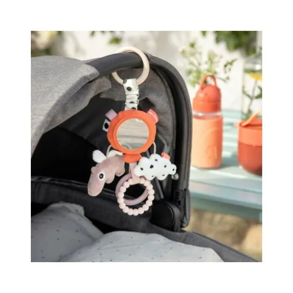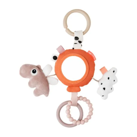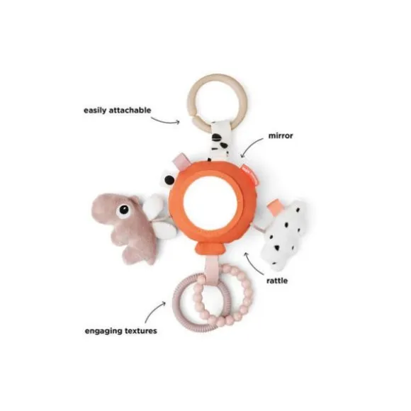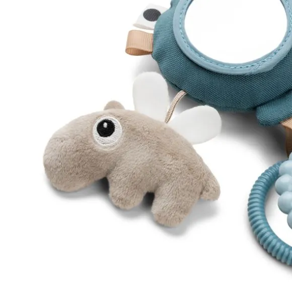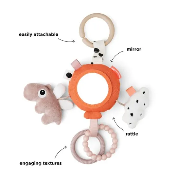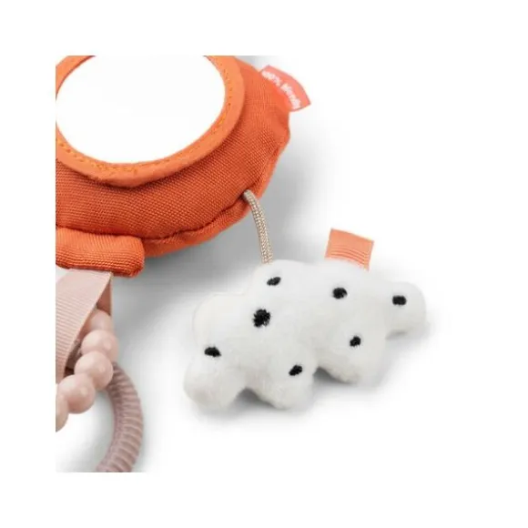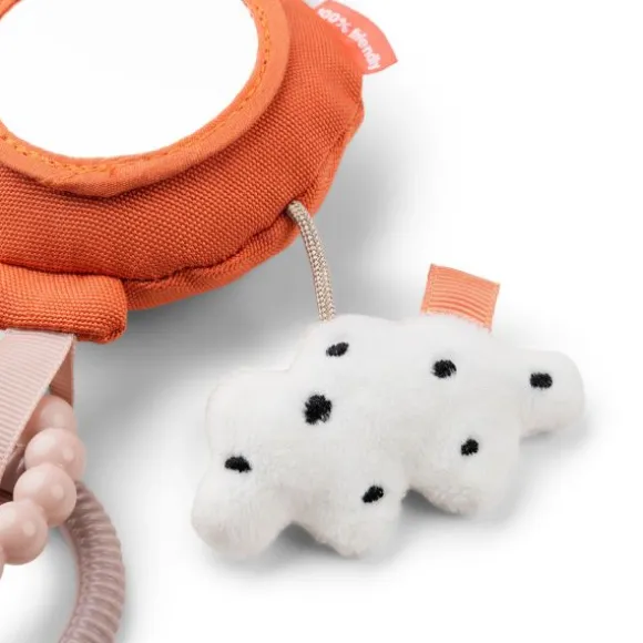 Met de Done By Deer Happy Clouds Activity Mirror – Blue hoeft je kindje zich niet meer te vervelen. Het speeltje beschikt over verschillende patronen en structuren, een spiegeltje, gekleurde labeltjes, een rammelaar, een bijtring en een knuffeltje. De vrolijke kleurtjes zullen je kindje uitdagen er mee te spelen. Door middel van een ring kan je het speeltje eenvoudig bevestigen aan de kinderwagen, buggy, box of autostoel.