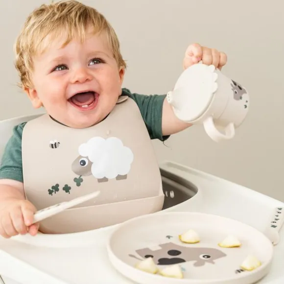 Maak etenstijd zorgeloos met de Done By Deer Sheepy Slab – Silicone – Sand! Deze schattige siliconen slab met een lief schaapje en klavertjes helpt knoeien te minimaliseren dankzij het diepe opvangbakje. Ideaal voor baby’s en peuters die zelfstandig leren eten!