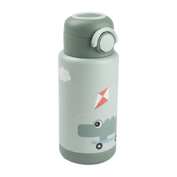 De Done by Deer Thermo Fles – Playground – Groen – 340 ml is perfect voor onderweg. Dankzij het dubbelwandige roestvrijstaal blijft de inhoud tot wel 6 uur warm of koud, ideaal voor warme chocolademelk in de winter of een verfrissend drankje in de zomer. Het vrolijke Croco & Birdee design maakt deze fles extra leuk voor kinderen en zorgt ervoor dat drinken op school, opvang of tijdens dagjes uit nog leuker wordt. De fles is voorzien van een handige drukknop, waardoor je kindje deze gemakkelijk zelf kan openen. De siliconen ring zorgt voor een luchtdichte, lekvrije afsluiting, zodat je hem zorgeloos in de tas kunt meenemen. Dankzij het stevige draaghandvat is de fles eenvoudig mee te nemen of aan een tas te bevestigen. Het BPA-vrije materiaal maakt het drinken veilig en gezond voor je kindje. Bovendien is de fles compact en licht van gewicht, waardoor hij goed in kleine kinderhandjes past. Een duurzame en praktische keuze voor elke dag!