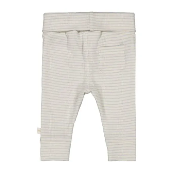 De subtiele streeppatronen in een combinatie van crème en blauw geven de broek een frisse, zachte uitstraling. De brede tailleband zorgt voor een comfortabele pasvorm en blijft goed zitten zonder te knellen. Aan de achterzijde is een klein opgestikt zakje toegevoegd voor een speels detail. De ribboorden aan de pijpen zorgen ervoor dat het broekje netjes blijft zitten, ook tijdens de eerste bewegingen van je kleintje.