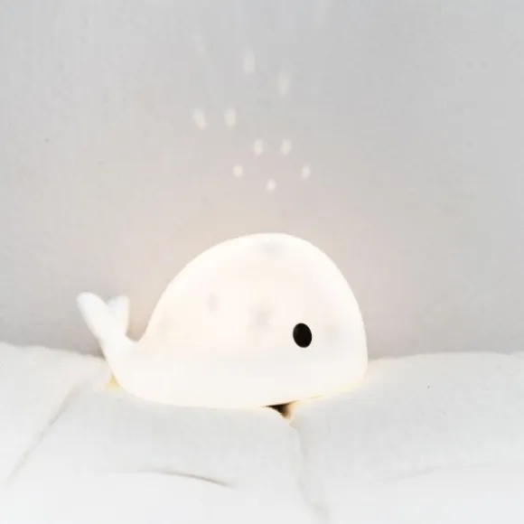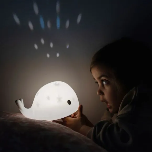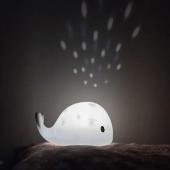 De Flow Amsterdam Moby Projector biedt alle opties om de baby- of kinderkamer in een rustgevende droomwereld te veranderen. De vrolijke projector vult het plafond met prachtig licht. Vooraf kan de projector worden ingesteld met een timer van 30 minuten zodat je kindje rustig in slaap kan komen. De baby projector dient ook als nachtlampje met sterretjes over het hele lichaam. Op de projector zitten zes verschillende licht opties: wit, blauw, geel, alle kleuren, vervagen tussen kleuren en alle kleuren aan / uit vervagen. Verder is de projector voorzien van een ingebouwde oplaadbare batterij en USB aansluiting. Alle opties zijn aan de onderkant te bedienen en geven jou en je kindje een perfecte nachtrust.