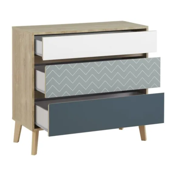 De commode is vervaardigd uit duurzame spaanplaat met een melamine afwerking en voorzien van subtiele witte en blauwe accenten voor een speelse twist. De stevige constructie en functionele vormgeving maken deze commode tot een onmisbaar meubelstuk dat perfect te combineren is met de andere items uit de Gami Larvik collectie.