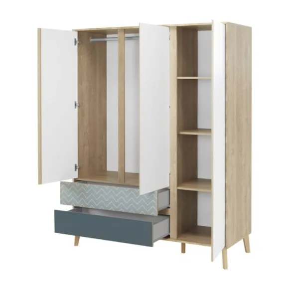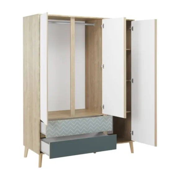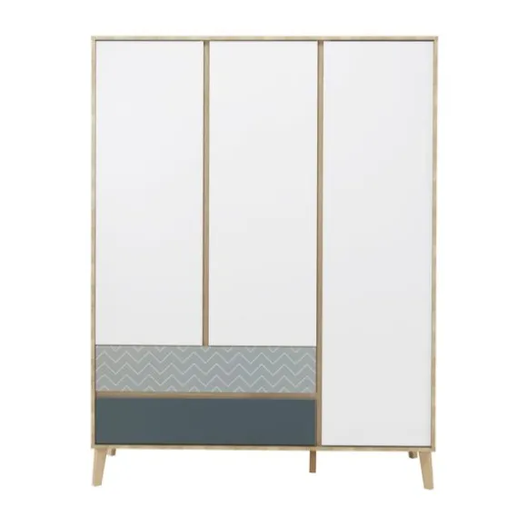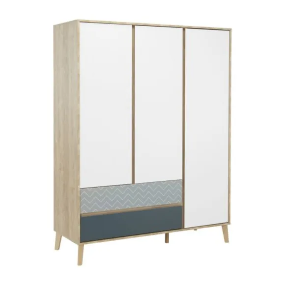 De kast beschikt over drie deuren en twee lades, waardoor er voldoende opbergruimte is voor kleding, accessoires en andere persoonlijke items. De deuren zijn voorzien van strakke handgrepen die bijdragen aan het minimalistische design.
