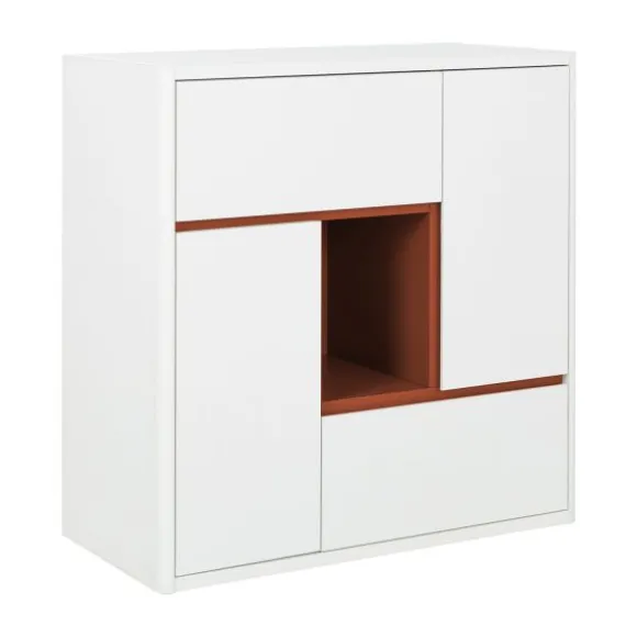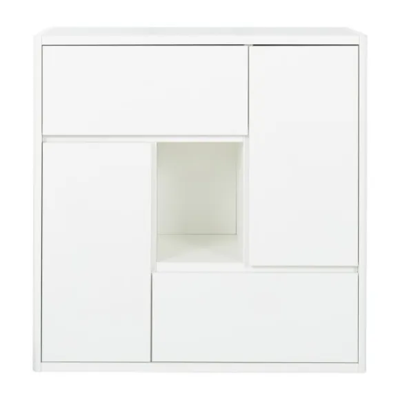 De speelse, asymmetrische indeling bevat meerdere gesloten vakken en een open compartiment in eikenhout-look. Dit open vak is ideaal om een favoriet item zoals een knuffel, boek of decoratiestuk in het zicht te plaatsen. De gesloten opbergvakken zorgen ervoor dat speelgoed, kleding of andere spulletjes netjes uit het zicht opgeborgen kunnen worden.