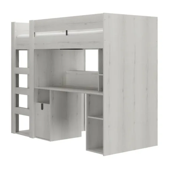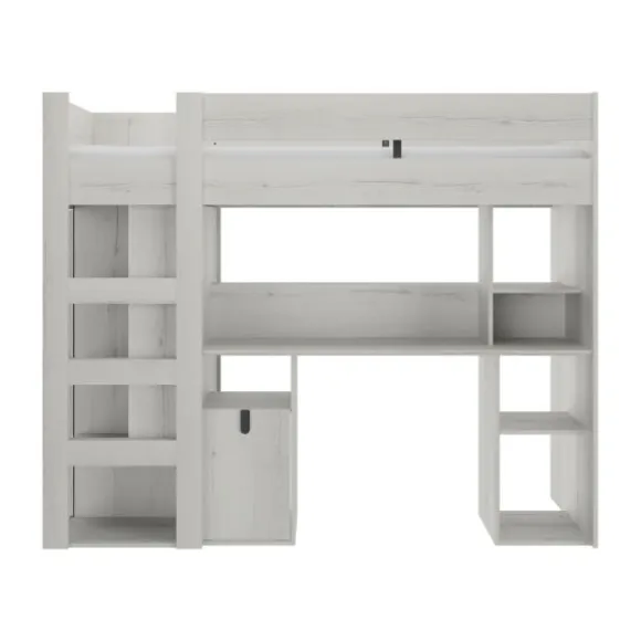 Onder het slaapgedeelte bevindt zich een ruim bureau met open schappen en een kastje, ideaal voor huiswerk, knutselspullen of schoolboeken. Aan de zijkant van het bed is een geïntegreerde kledingkast geplaatst met praktische legplanken. De stevige, brede trap zorgt voor een veilige toegang tot het bed en biedt extra open vakken aan de zijkant voor schoenen, speelgoed of decoratie.